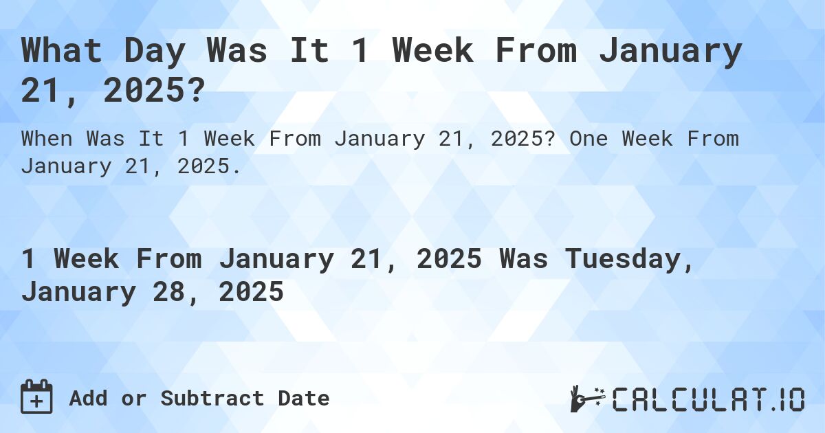 The online Add or Subtract Date calculator is a convenient tool for anyone looking to quickly and easily calculate a date in the past or future. With this calculator, you can add or subtract any number of days, weeks, months, or years from a given date and find out what day it will be. For example, it can help you find out when Was It 1 Week From January 21, 2025? (The answer is: January 28, 2025).