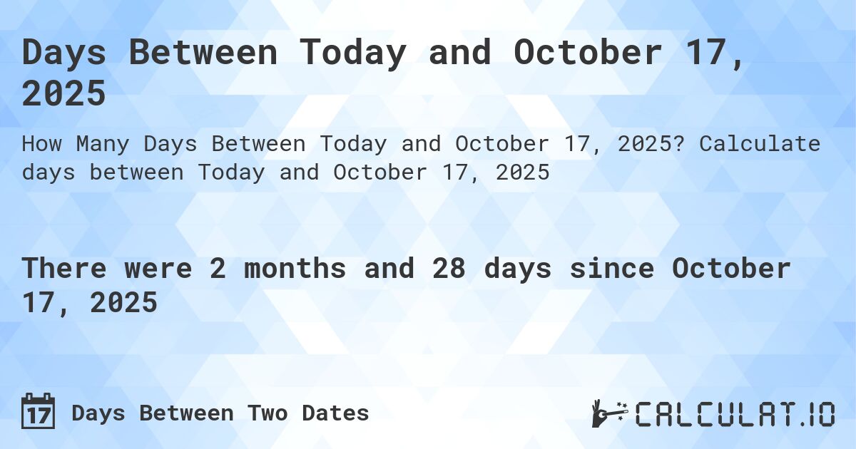 To use the calculator, simply input the first date in the designated field using the following format: Month Day, Year (e.g. 'Today'). Then input the second date in the same format in the second designated field (e.g. 'October 17, 2025').