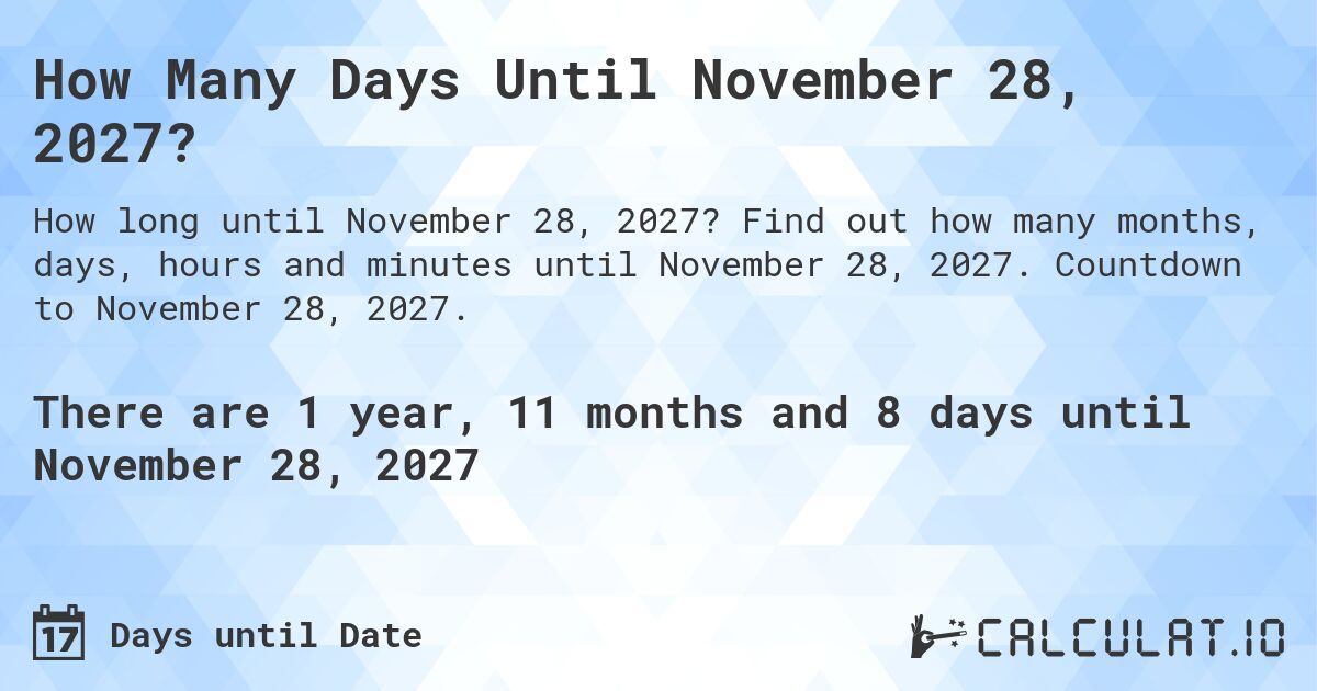 This online date calculator will help you calculate how many days are left until a given date. For example, it's easy to find out how much time is left until your birthday. You can also find out how much time has passed since a given date. For example, it can help you find out how long until November 28, 2027? (The answer is: 1 year, 11 months and 9 days). Select the date you want (e.g. 'November 28, 2027') and hit the 'Calculate' button.