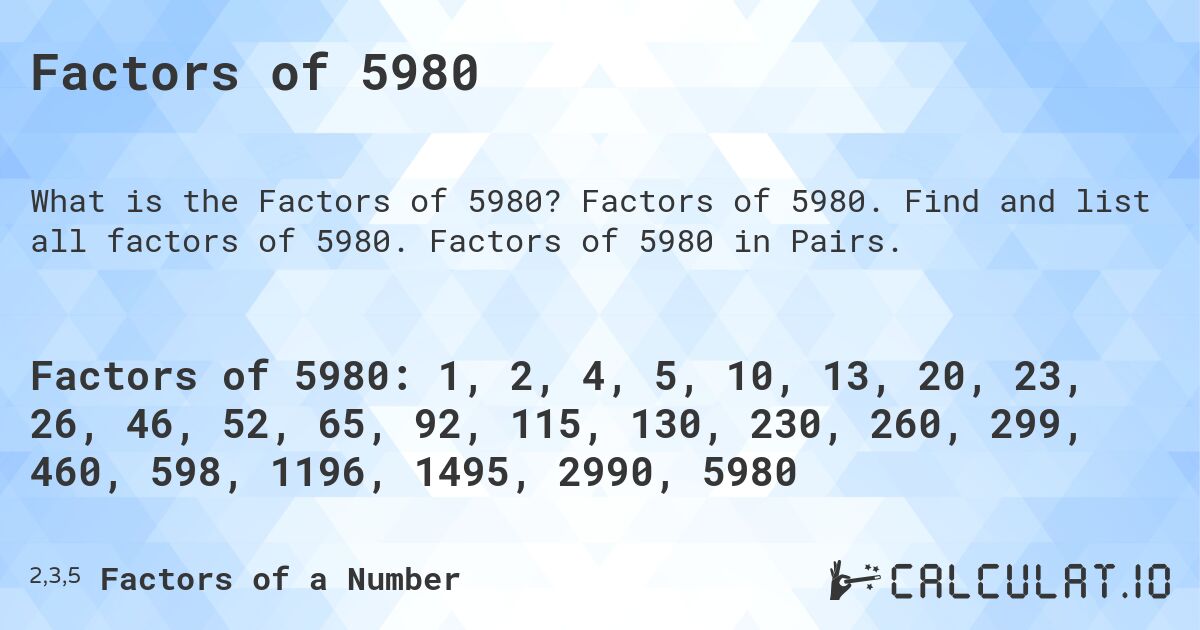 Answer: Factors of 5980: 1, 2, 4, 5, 10, 13, 20, 23, 26, 46, 52, 65, 92, 115, 130, 230, 260, 299, 460, 598, 1196, 1495, 2990, 5980