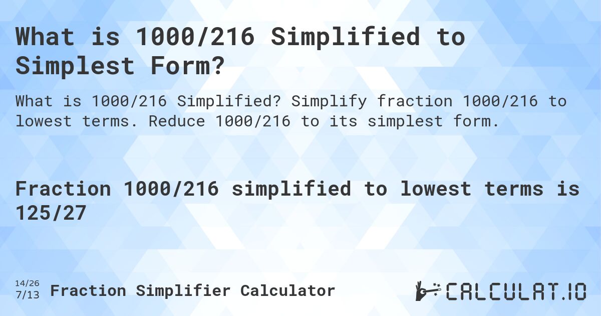 Answer: Fraction 1000/216 simplified to lowest terms is 125/27