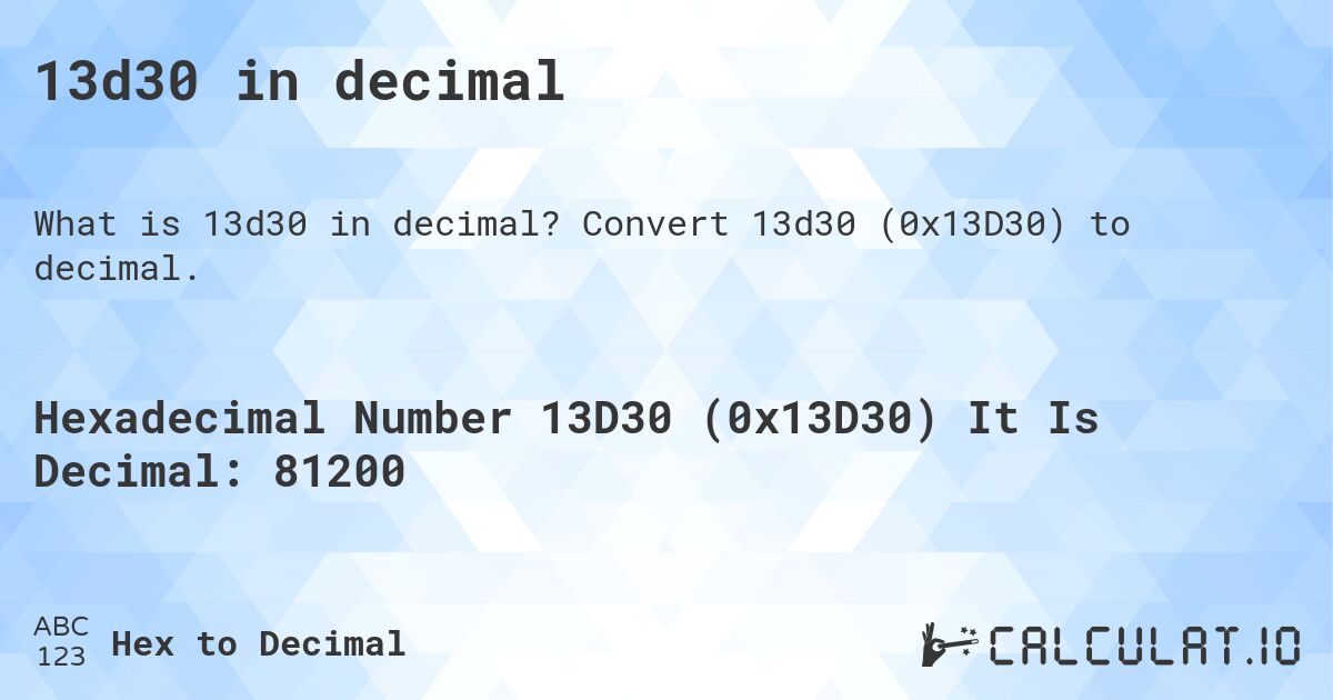 This calculator will help you to convert hexadecimal numbers to decimal. For example, it can help you find out what is 13d30 in decimal? (The answer is: 81200). Enter hexadecimal number (e.g. '13d30') and hit the 'Convert' button.