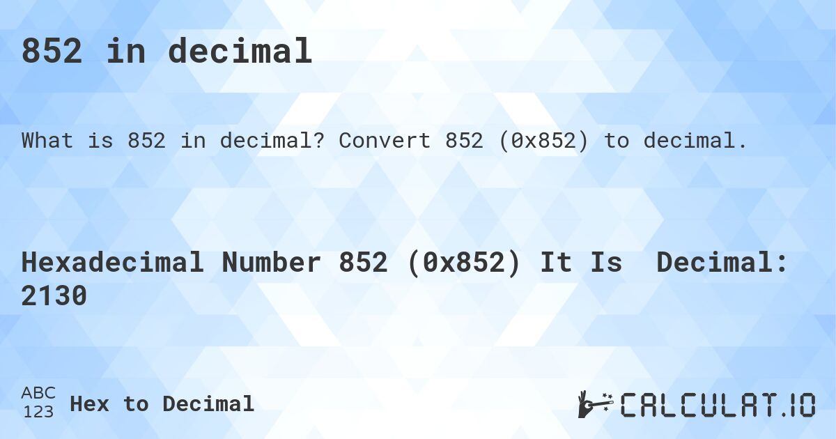 This calculator will help you to convert hexadecimal numbers to decimal. For example, it can help you find out what is 852 in decimal? (The answer is: 2130). Enter hexadecimal number (e.g. '852') and hit the 'Convert' button.