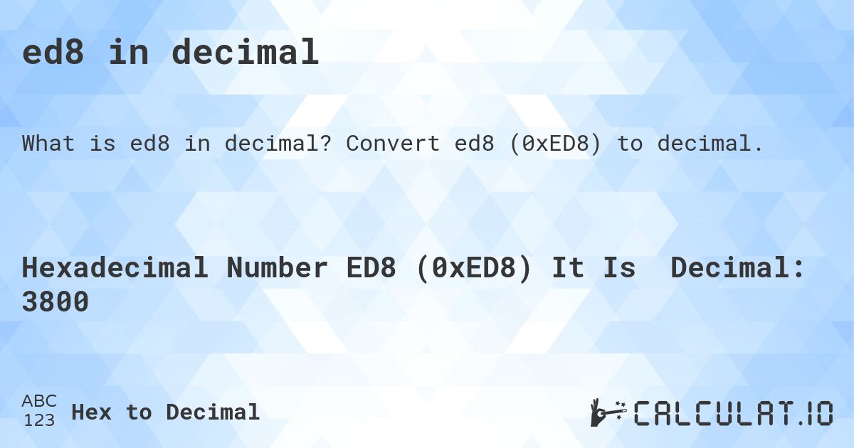 This calculator will help you to convert hexadecimal numbers to decimal. For example, it can help you find out what is ed8 in decimal? (The answer is: 3800). Enter hexadecimal number (e.g. 'ed8') and hit the 'Convert' button.