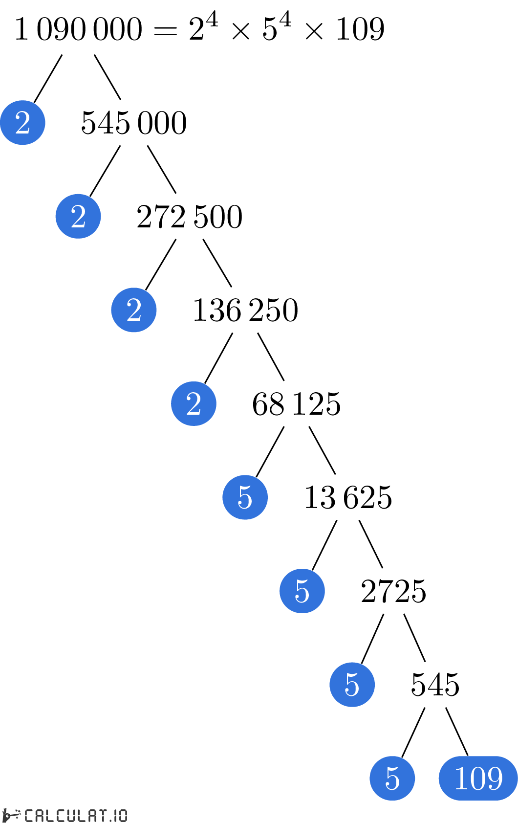 Now we have all the Prime Factors for number 1090000. It is: 2, 2, 2, 2, 5, 5, 5, 5, 109