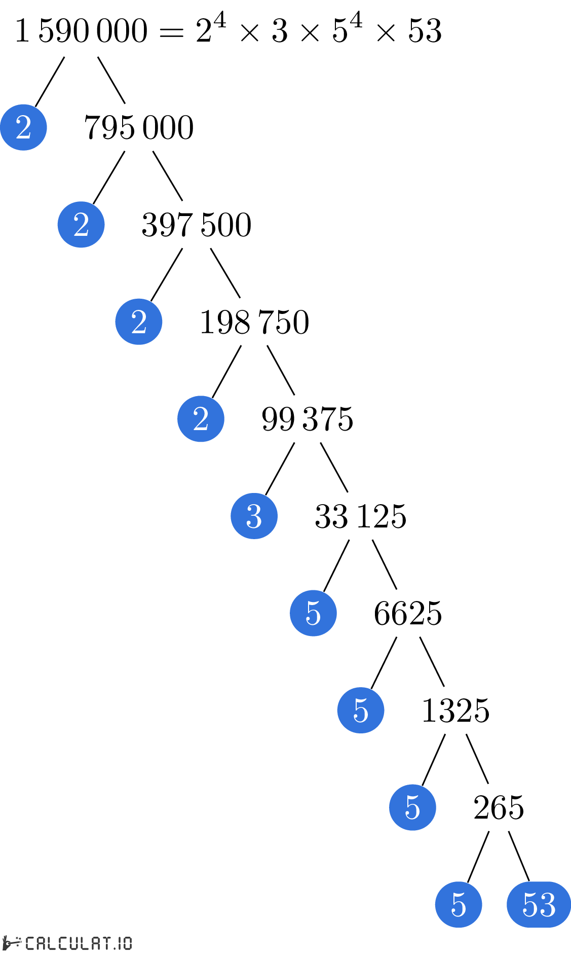 Now we have all the Prime Factors for number 1590000. It is: 2, 2, 2, 2, 3, 5, 5, 5, 5, 53