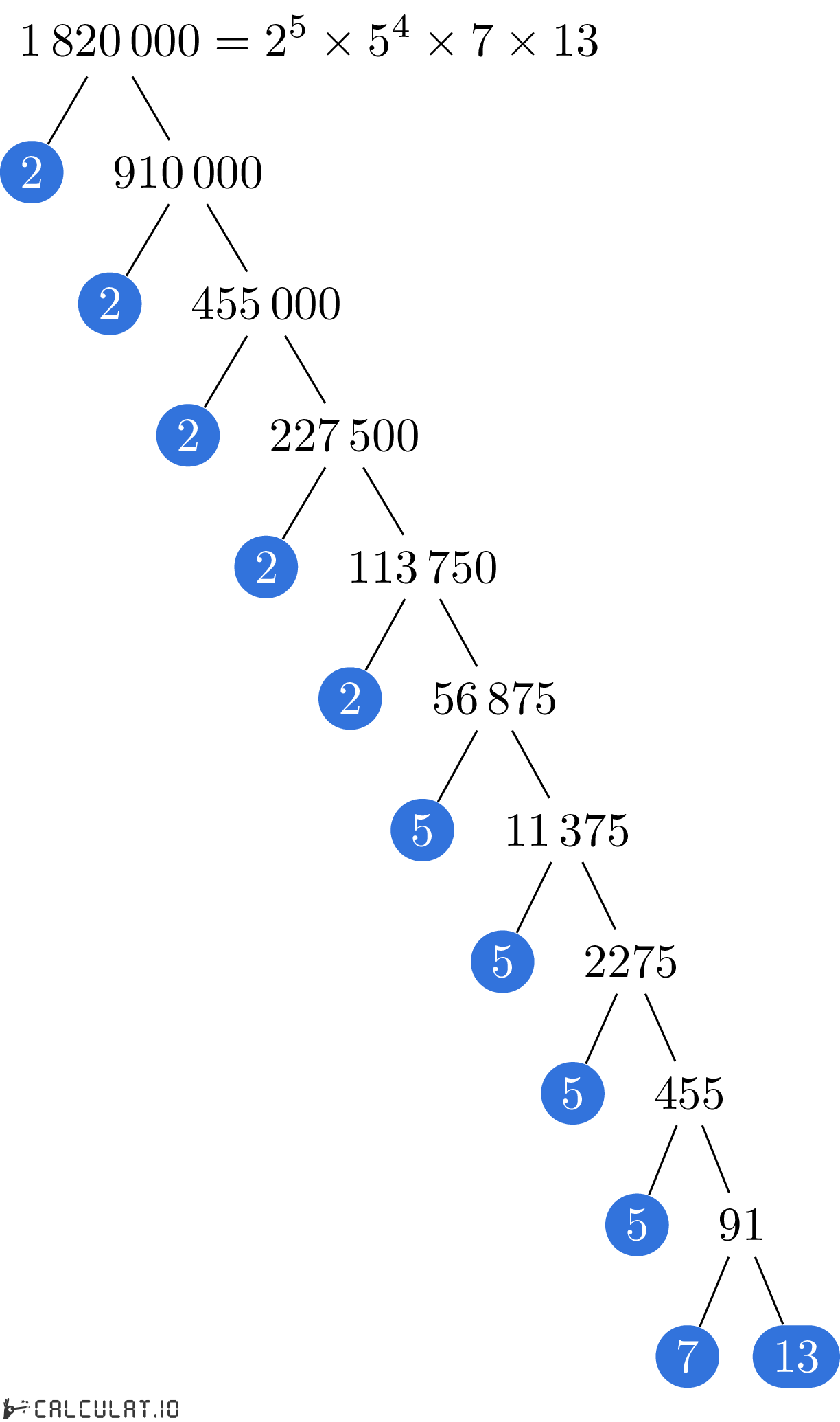 Now we have all the Prime Factors for number 1820000. It is: 2, 2, 2, 2, 2, 5, 5, 5, 5, 7, 13