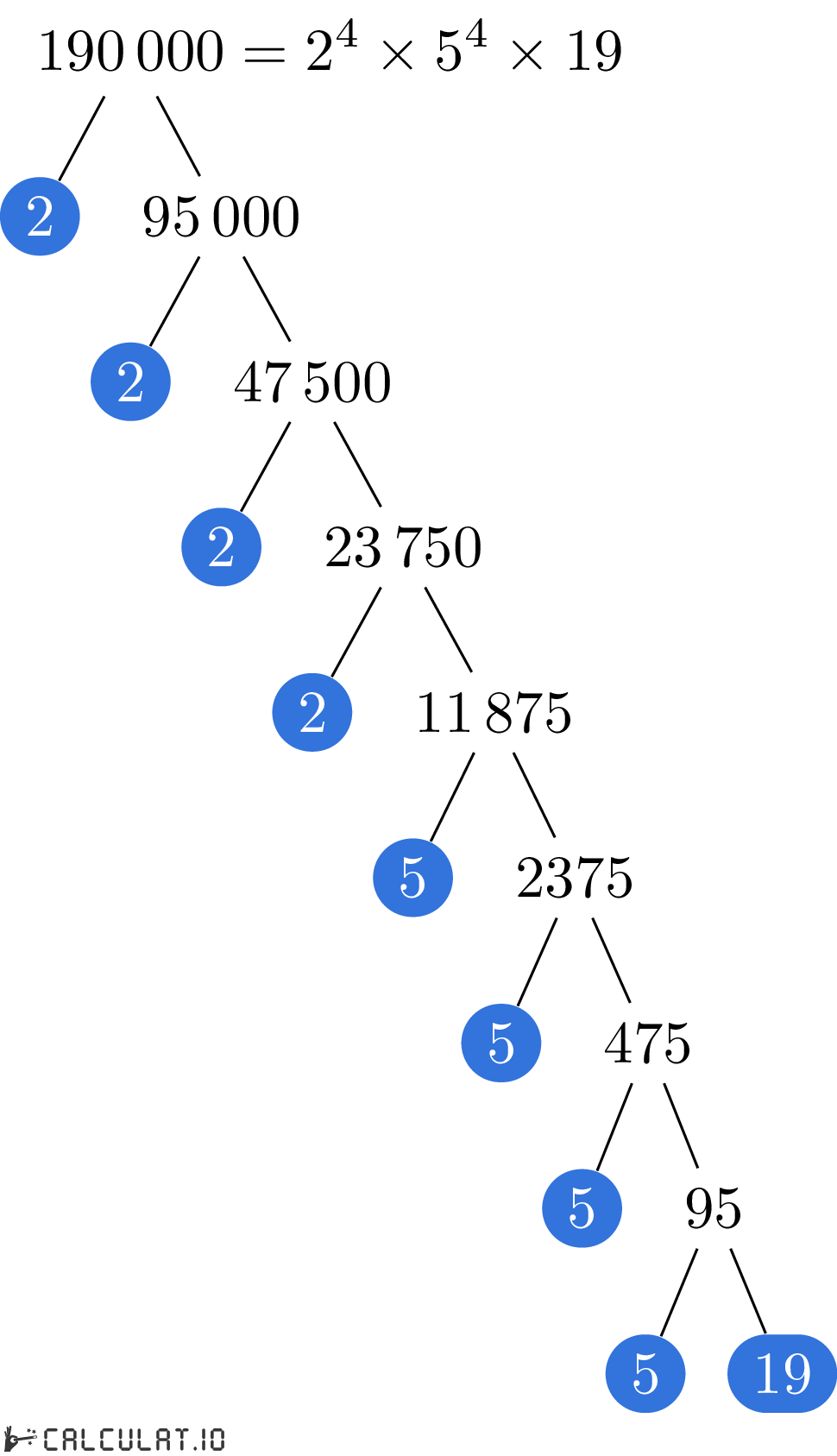 The smallest Prime Number which can divide 190000 without a remainder is 2. So the first calculation step would look like: