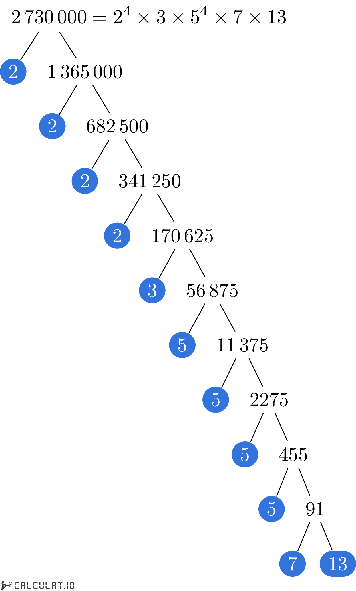 Now we have all the Prime Factors for number 2730000. It is: 2, 2, 2, 2, 3, 5, 5, 5, 5, 7, 13