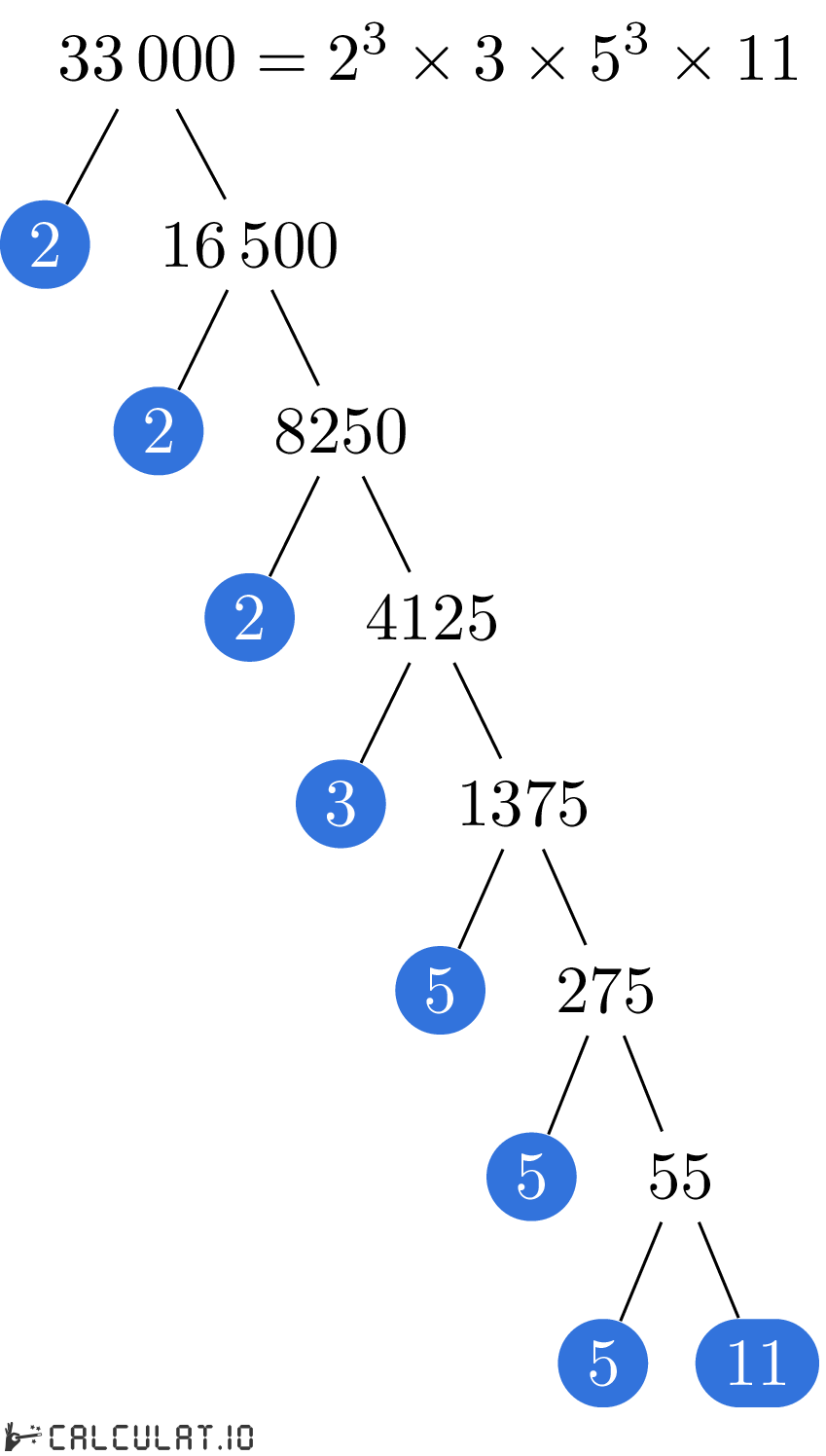 Now we have all the Prime Factors for number 33000. It is: 2, 2, 2, 3, 5, 5, 5, 11