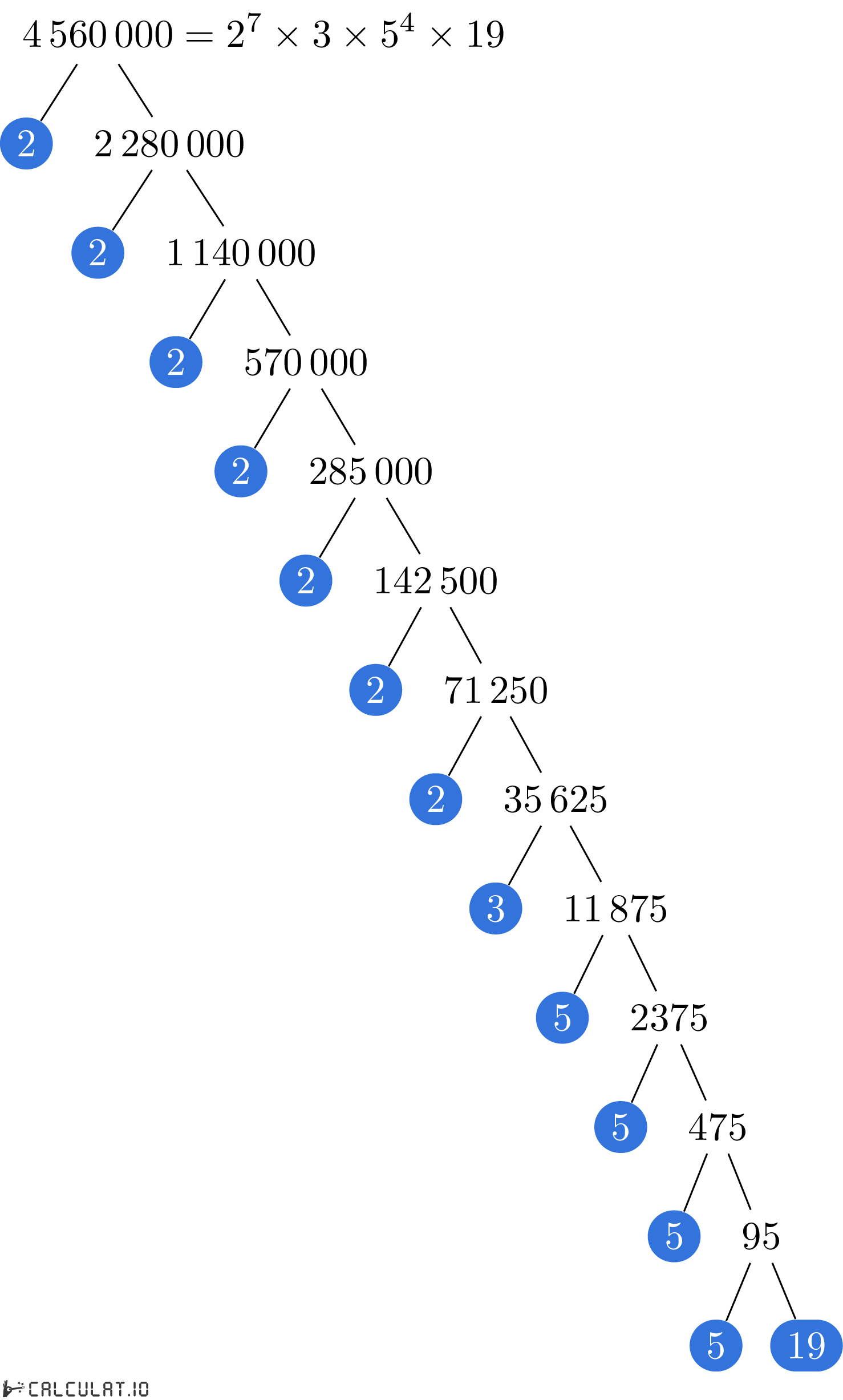 Now we have all the Prime Factors for number 4560000. It is: 2, 2, 2, 2, 2, 2, 2, 3, 5, 5, 5, 5, 19