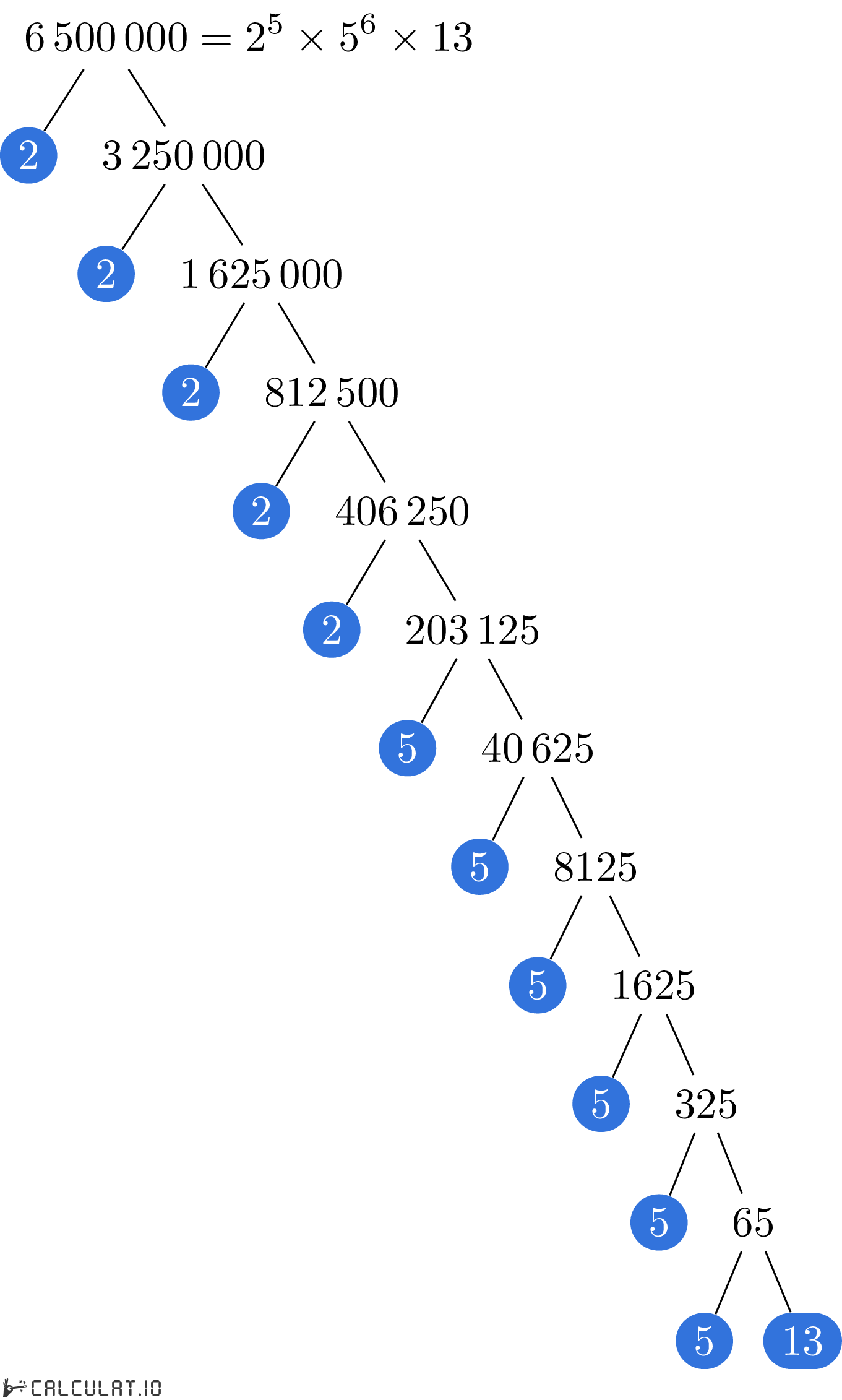 Now we have all the Prime Factors for number 6500000. It is: 2, 2, 2, 2, 2, 5, 5, 5, 5, 5, 5, 13