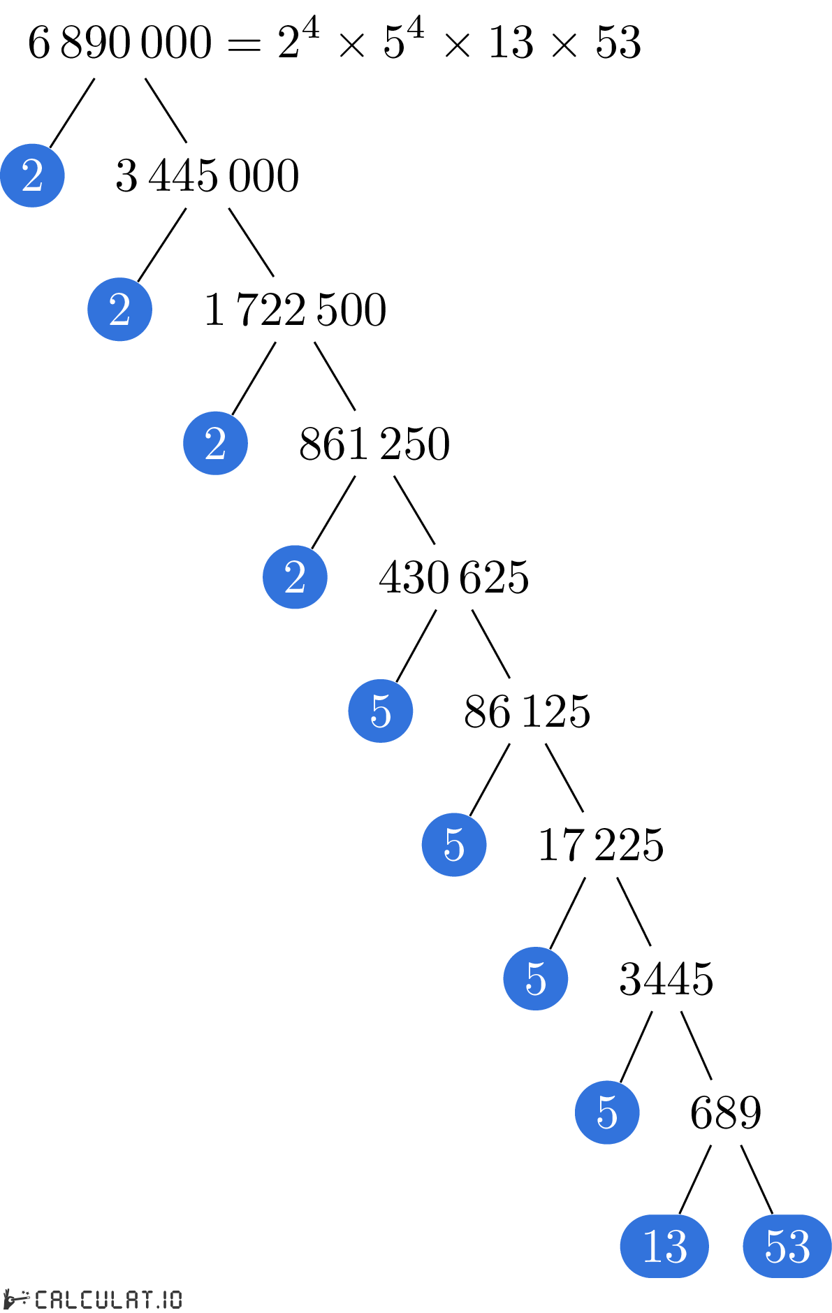 Now we have all the Prime Factors for number 6890000. It is: 2, 2, 2, 2, 5, 5, 5, 5, 13, 53