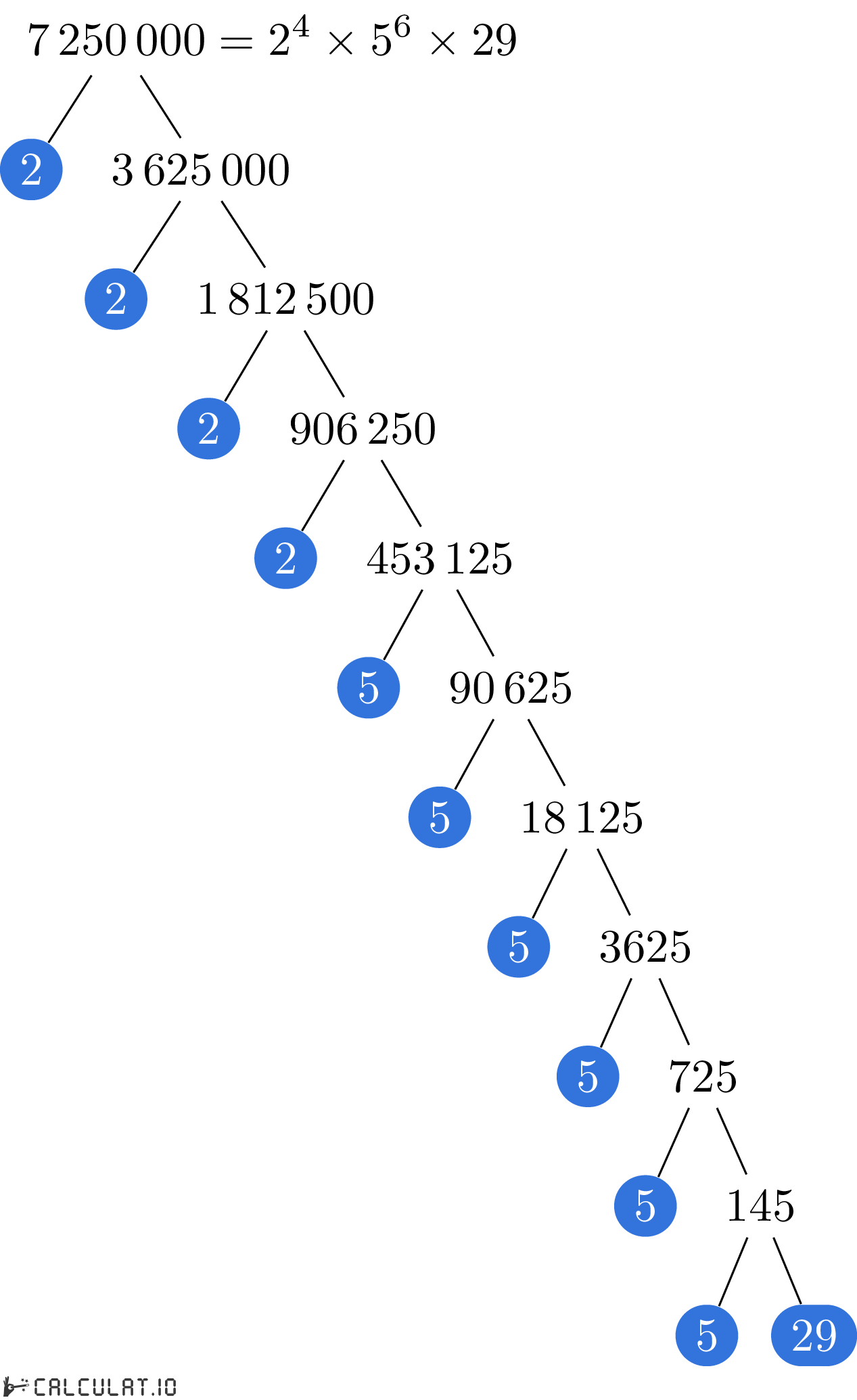 Now we have all the Prime Factors for number 7250000. It is: 2, 2, 2, 2, 5, 5, 5, 5, 5, 5, 29