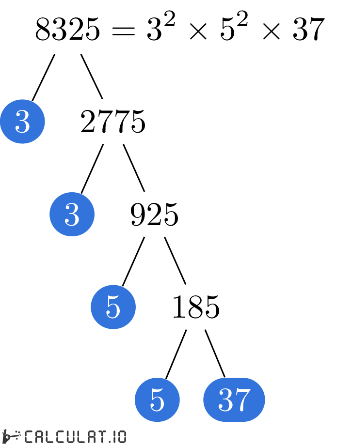 Now we have all the Prime Factors for number 8325. It is: 3, 3, 5, 5, 37