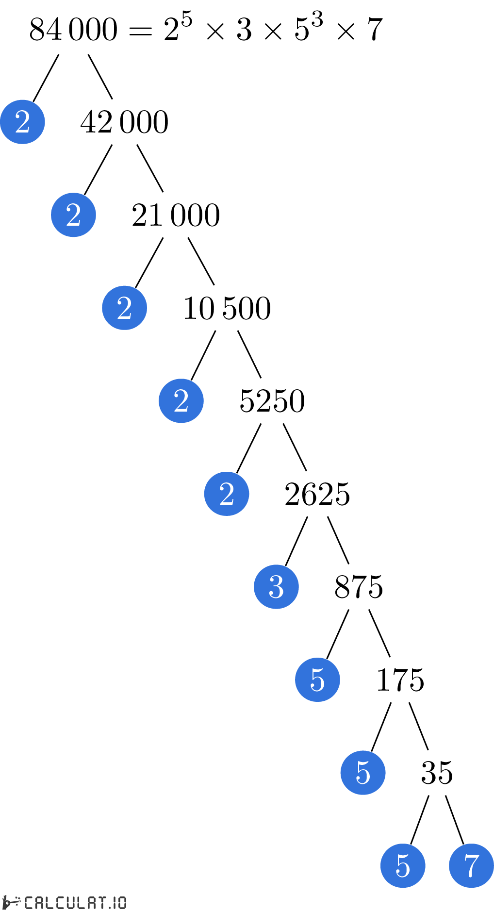 Prime Factorization of 84000 is expressing 84000 as the product of prime factors. In other words, it is finding which prime numbers should be multiplied together to make 84000.