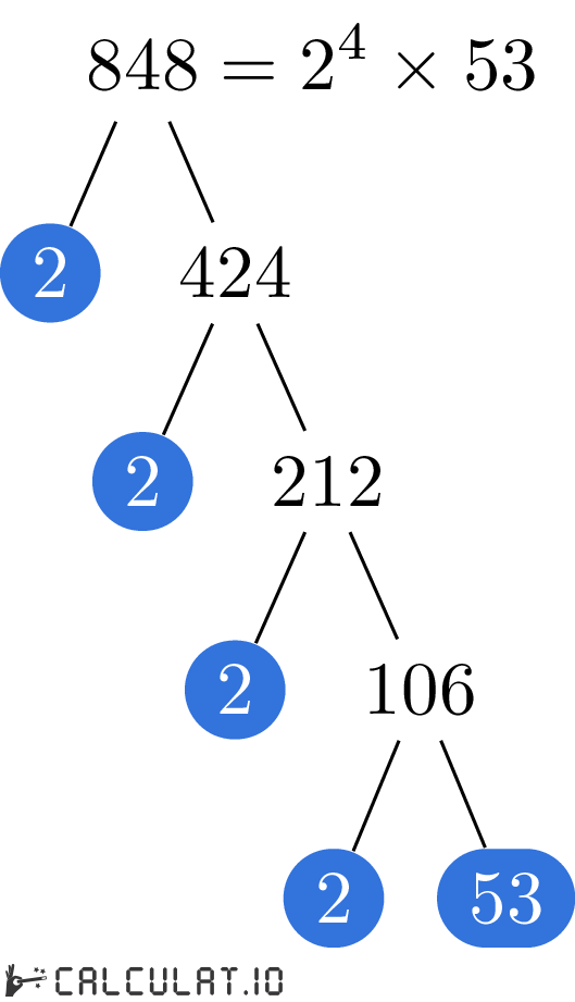 Now we have all the Prime Factors for number 848. It is: 2, 2, 2, 2, 53