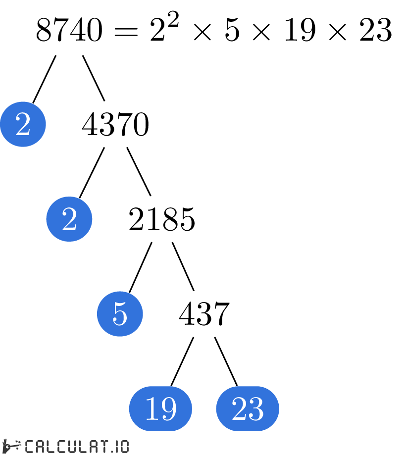 Now we have all the Prime Factors for number 8740. It is: 2, 2, 5, 19, 23