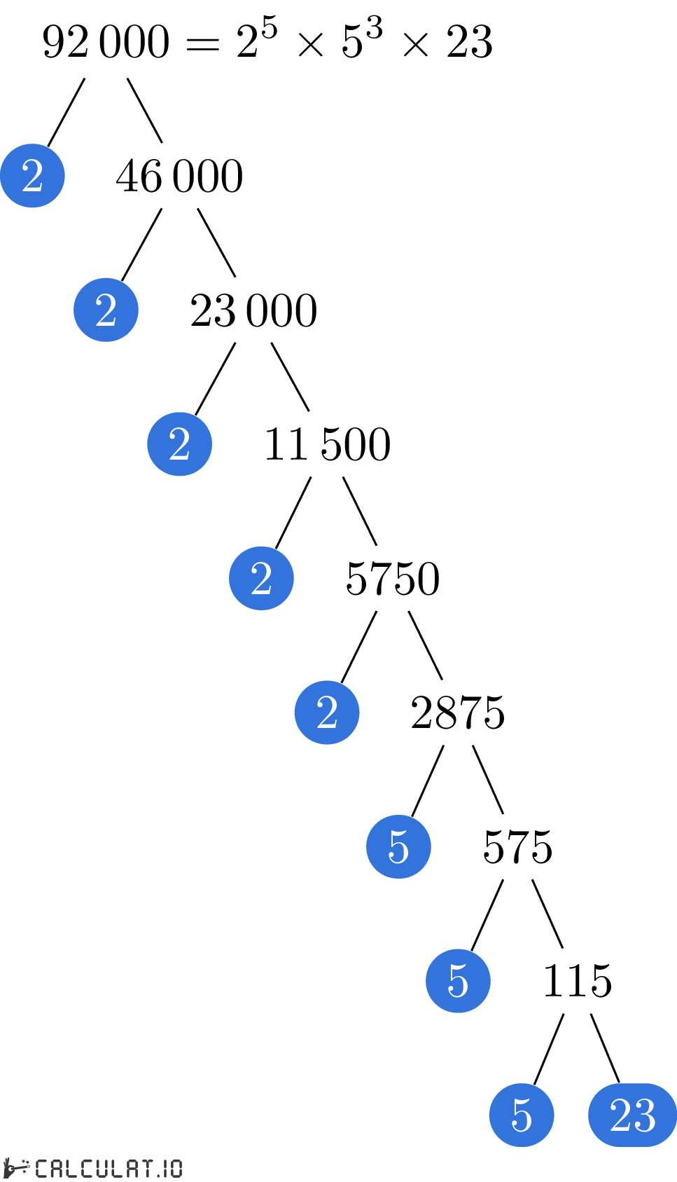 Now we have all the Prime Factors for number 92000. It is: 2, 2, 2, 2, 2, 5, 5, 5, 23
