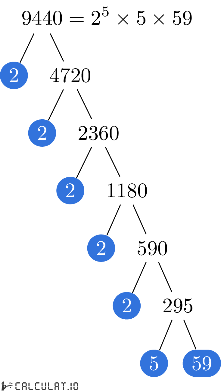 Now we have all the Prime Factors for number 9440. It is: 2, 2, 2, 2, 2, 5, 59