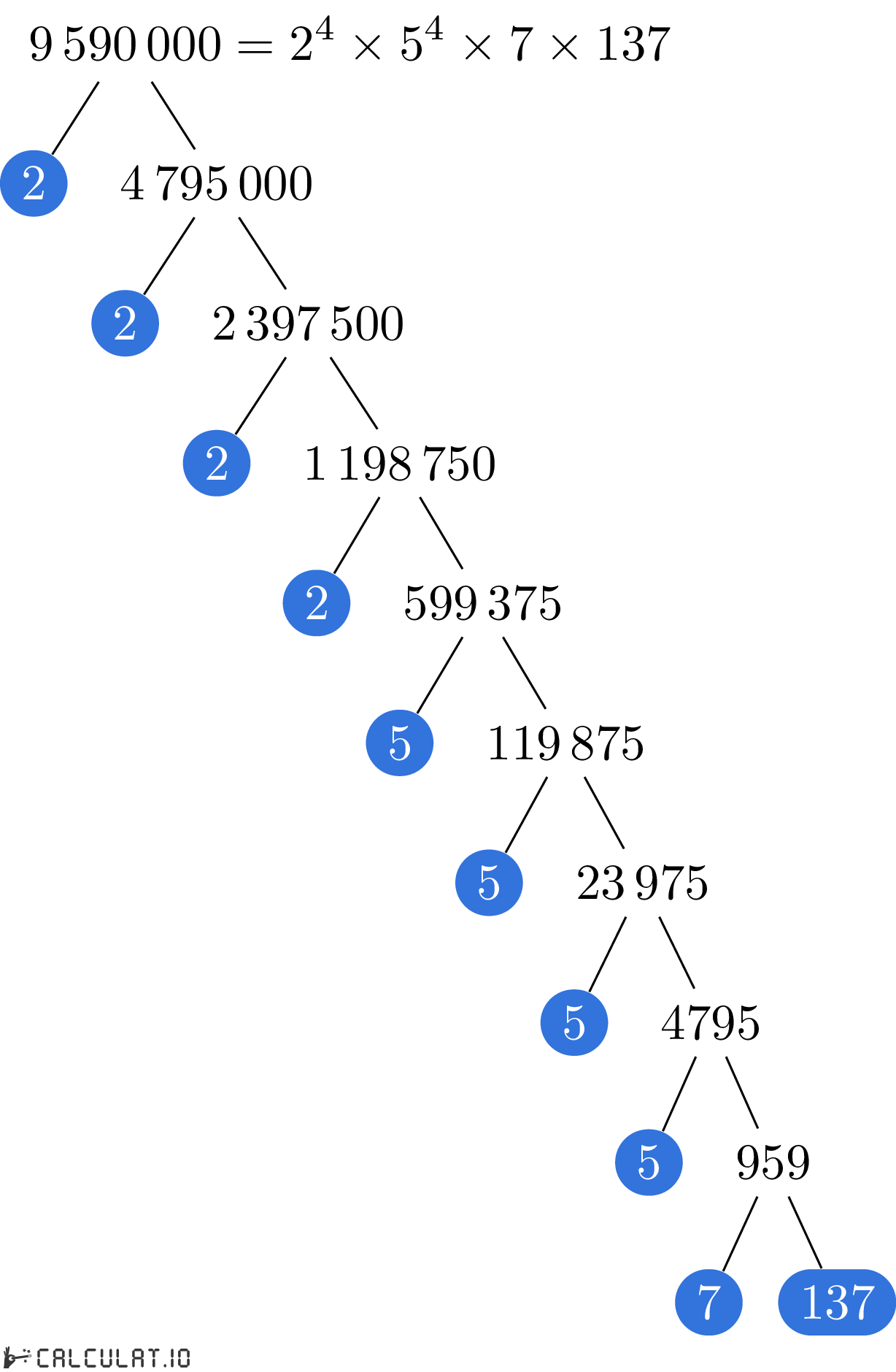 Now we have all the Prime Factors for number 9590000. It is: 2, 2, 2, 2, 5, 5, 5, 5, 7, 137