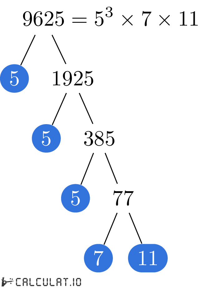 The smallest Prime Number which can divide 9625 without a remainder is 5. So the first calculation step would look like: