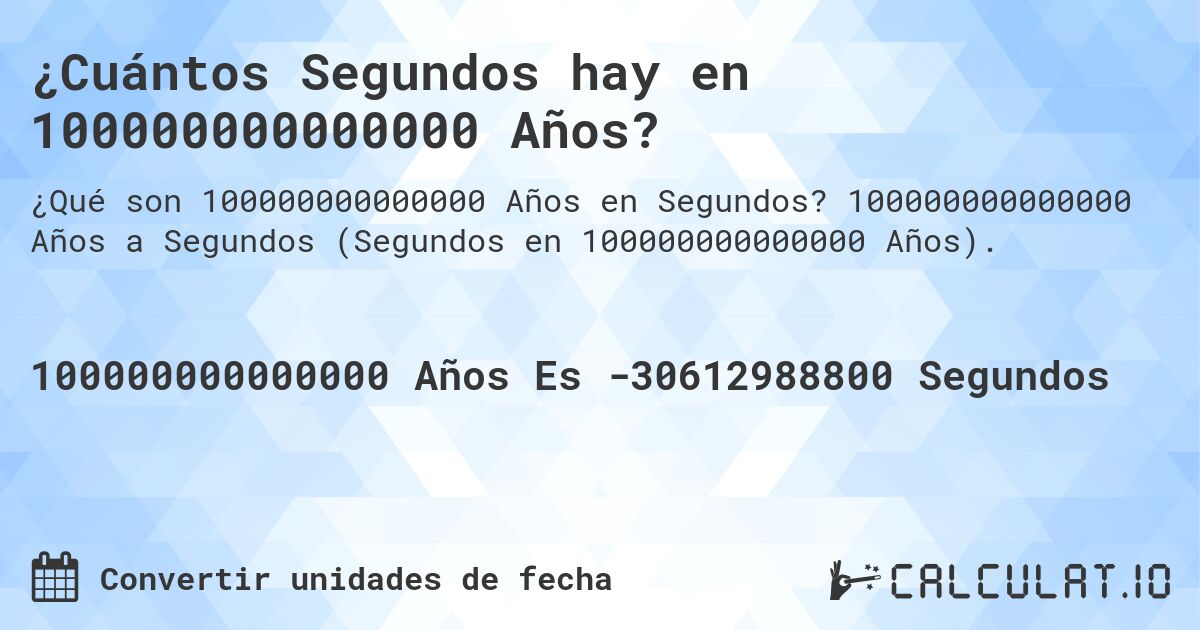 Un convertidor en línea de unidades de tiempo es una herramienta útil que te ayuda a convertir de manera rápida y precisa las duraciones de tiempo de una unidad a otra. Ya sea que necesites convertir segundos, minutos, horas, días, semanas, meses o años, esta herramienta simplifica el proceso. Con este convertidor, puedes realizar conversiones de períodos de tiempo de manera fácil y rápida a una unidad de medida diferente. Por ejemplo, ¿puede ayudarte a determinar ¿Qué son 100000000000000 Años en Segundos? (La respuesta es: -30612988800).