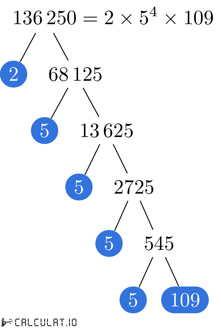 Factores primos de 136250: 2, 5, 5, 5, 5, 109