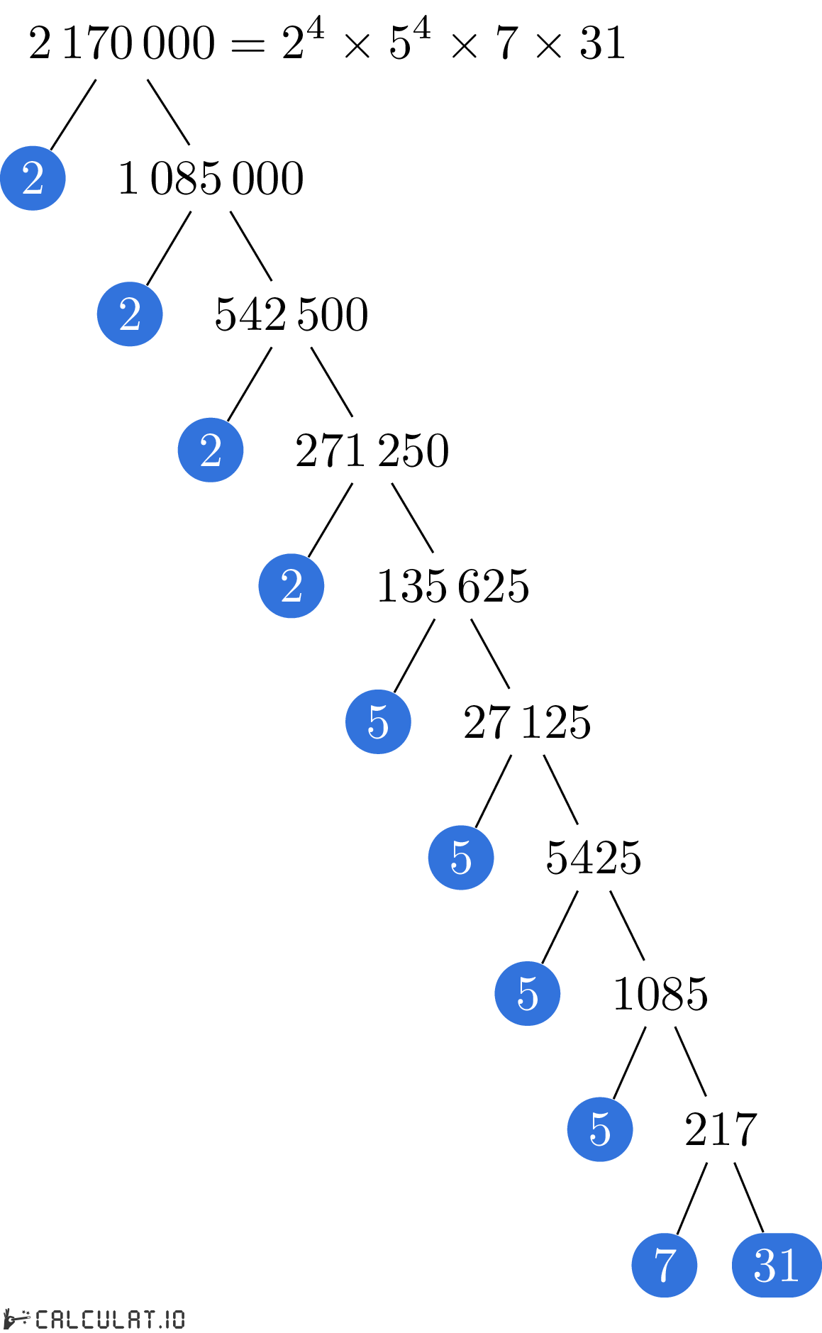 Factores primos de 2170000: 2, 2, 2, 2, 5, 5, 5, 5, 7, 31