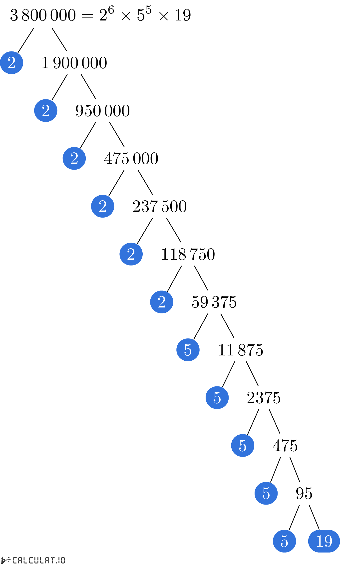 Factores primos de 3800000: 2, 2, 2, 2, 2, 2, 5, 5, 5, 5, 5, 19