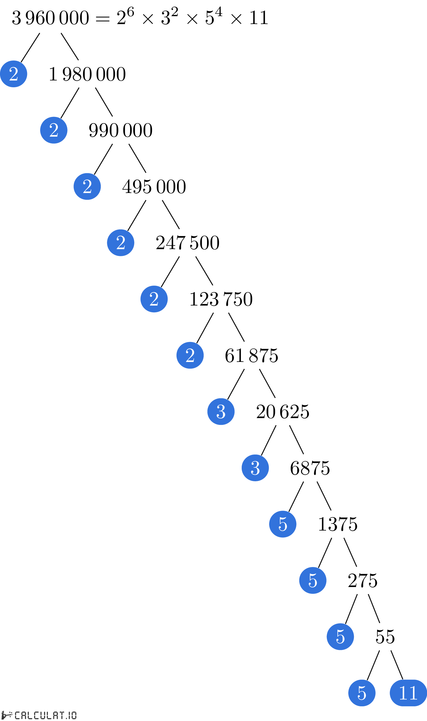 Factores primos de 3960000: 2, 2, 2, 2, 2, 2, 3, 3, 5, 5, 5, 5, 11