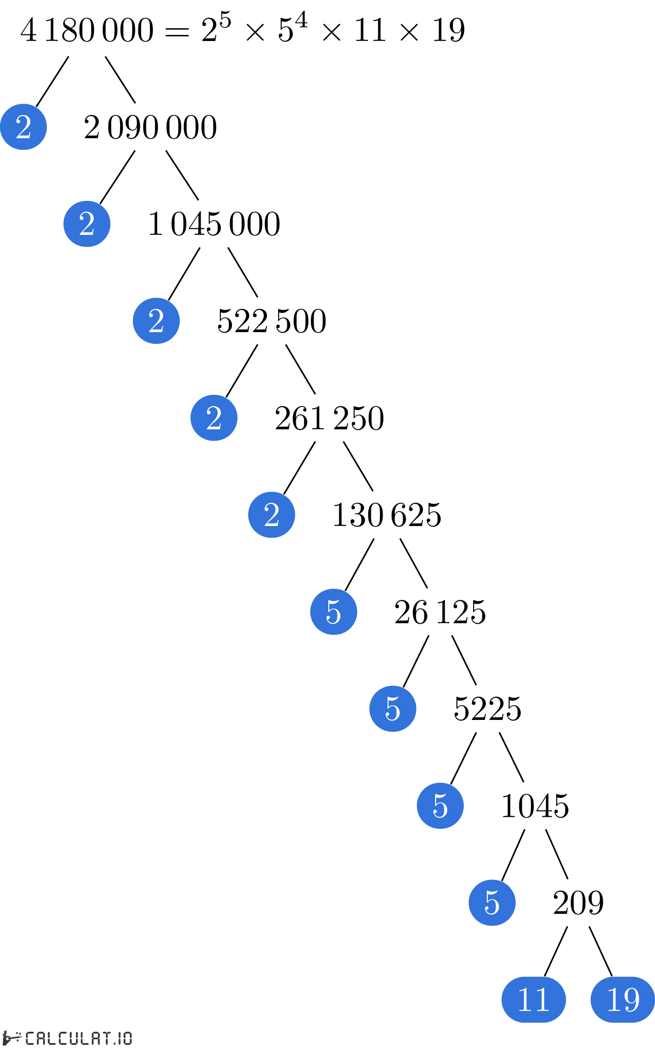 Factores primos de 4180000: 2, 2, 2, 2, 2, 5, 5, 5, 5, 11, 19