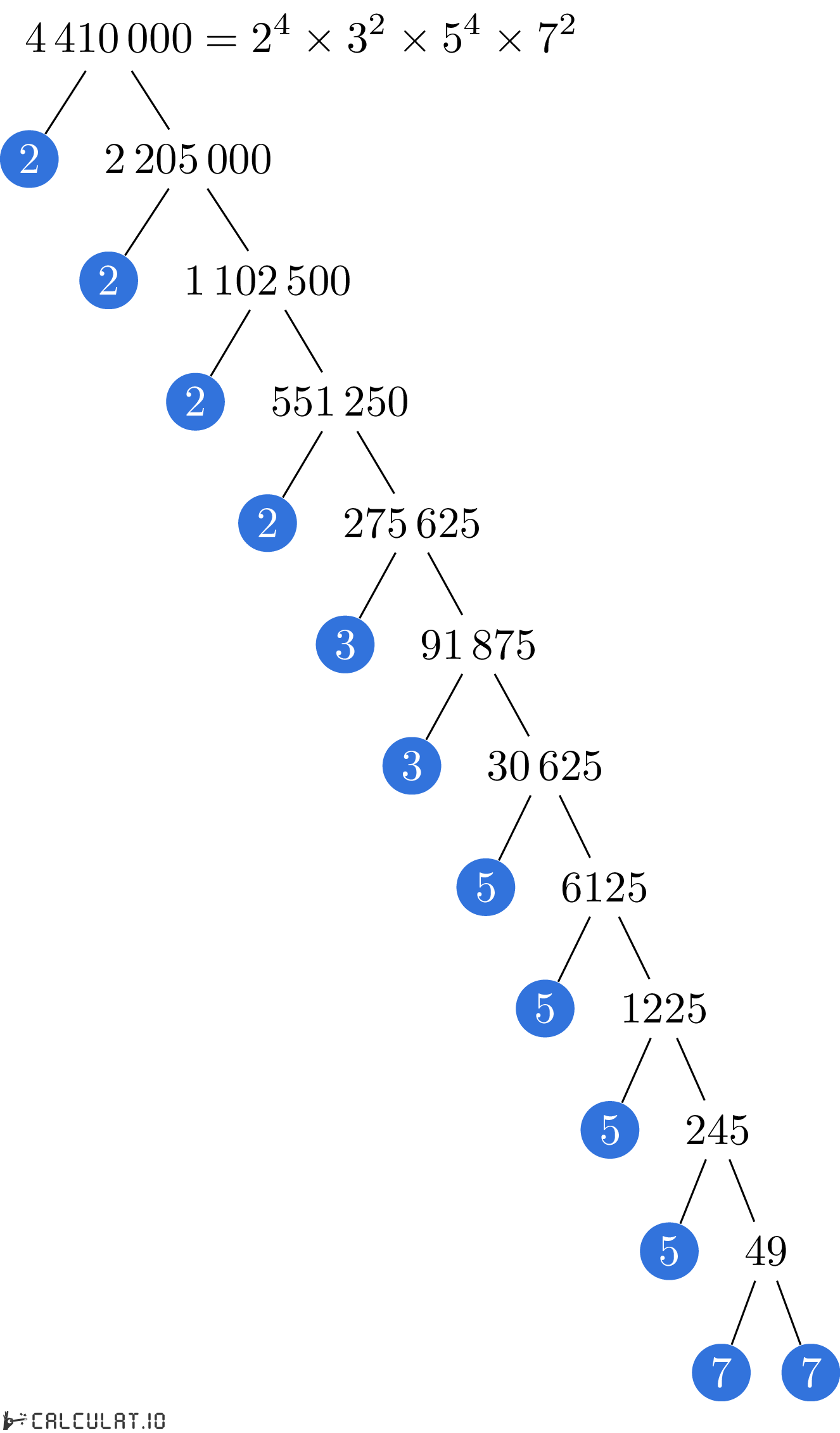 Factores primos de 4410000: 2, 2, 2, 2, 3, 3, 5, 5, 5, 5, 7, 7