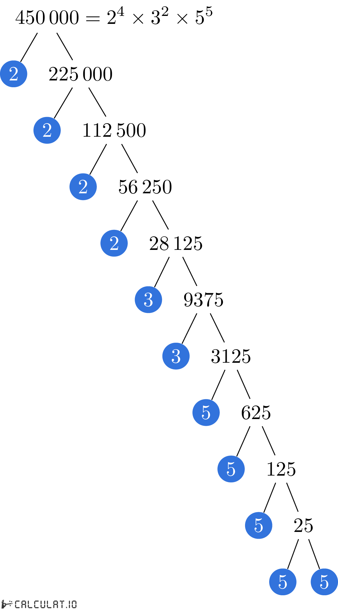 Factores primos de 450000: 2, 2, 2, 2, 3, 3, 5, 5, 5, 5, 5