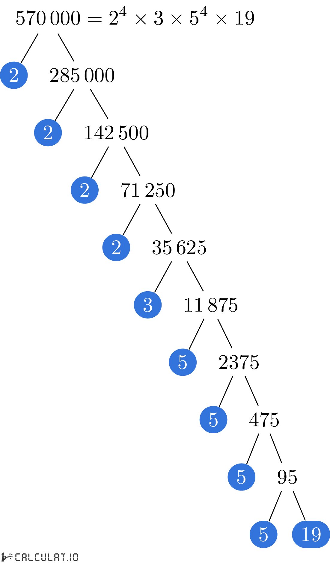 Factores primos de 570000: 2, 2, 2, 2, 3, 5, 5, 5, 5, 19
