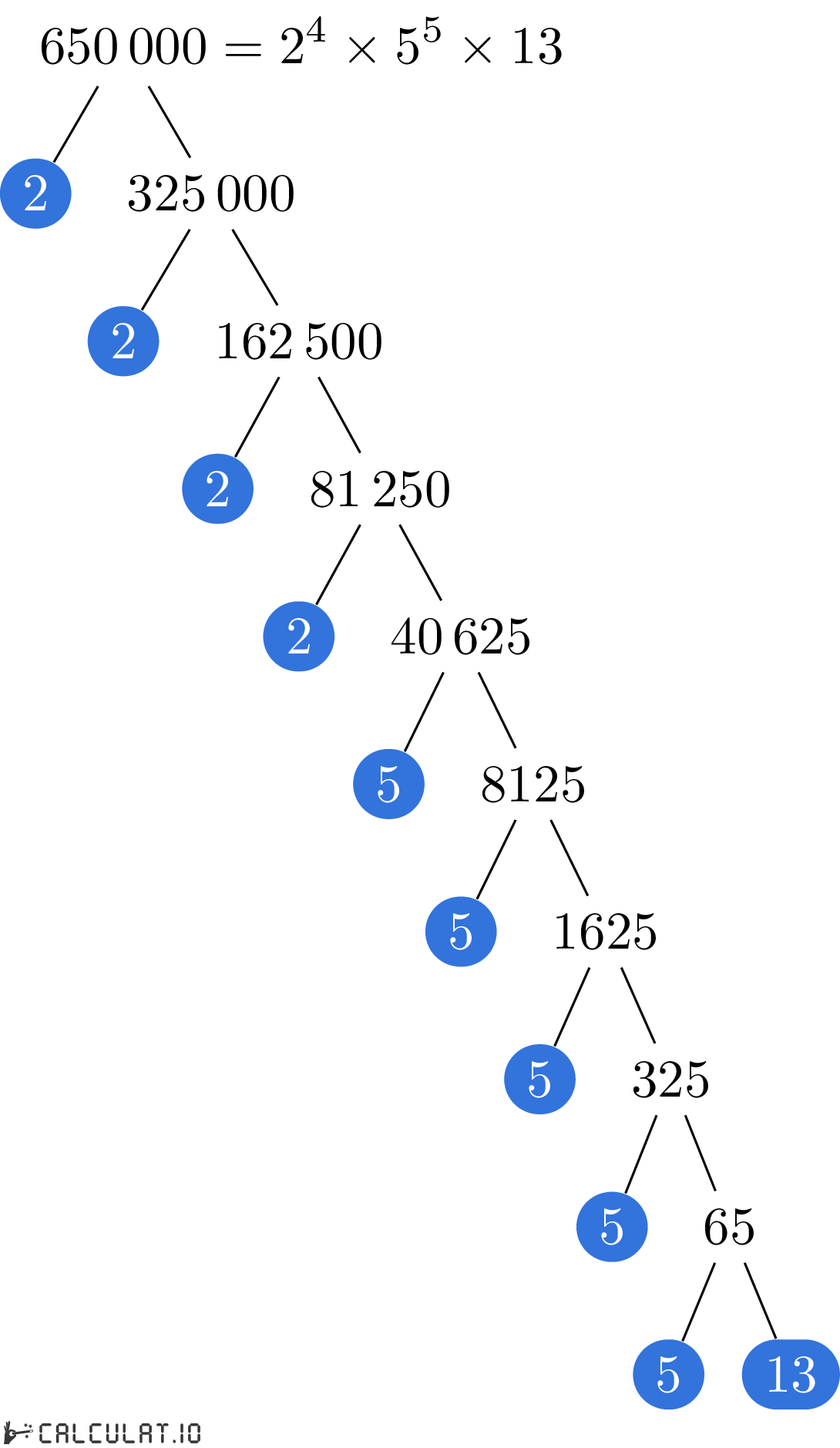 Factores primos de 650000: 2, 2, 2, 2, 5, 5, 5, 5, 5, 13