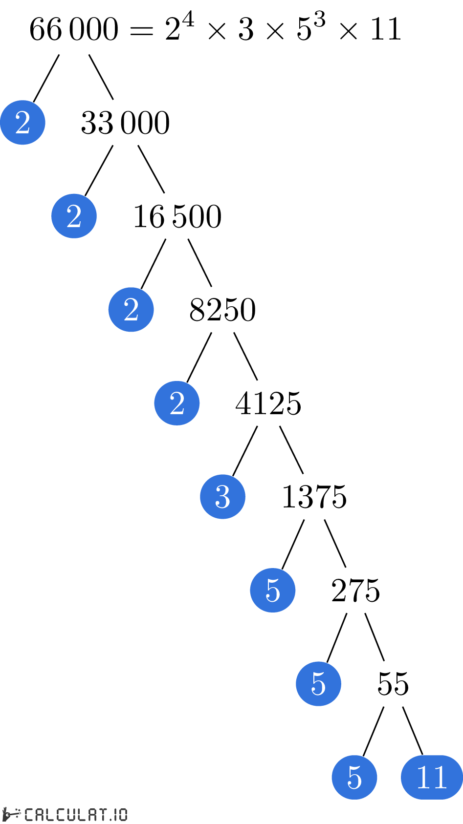 Factores primos de 66000: 2, 2, 2, 2, 3, 5, 5, 5, 11
