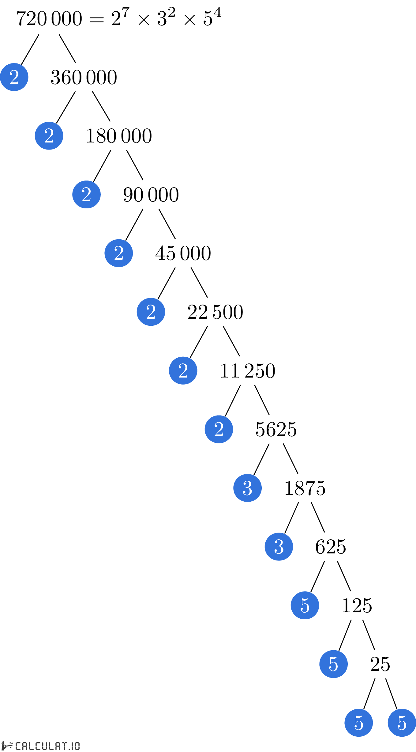Factores primos de 720000: 2, 2, 2, 2, 2, 2, 2, 3, 3, 5, 5, 5, 5