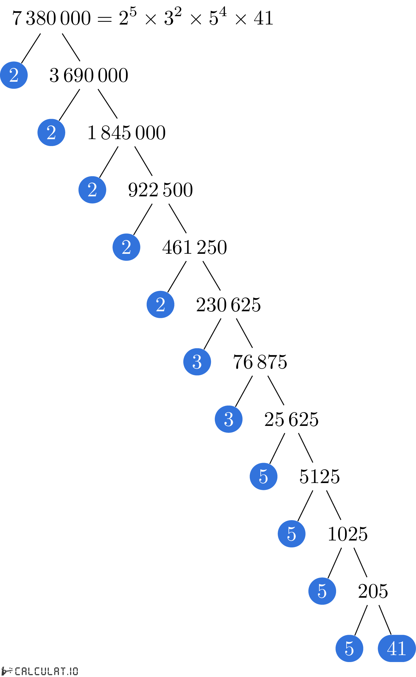 Factores primos de 7380000: 2, 2, 2, 2, 2, 3, 3, 5, 5, 5, 5, 41