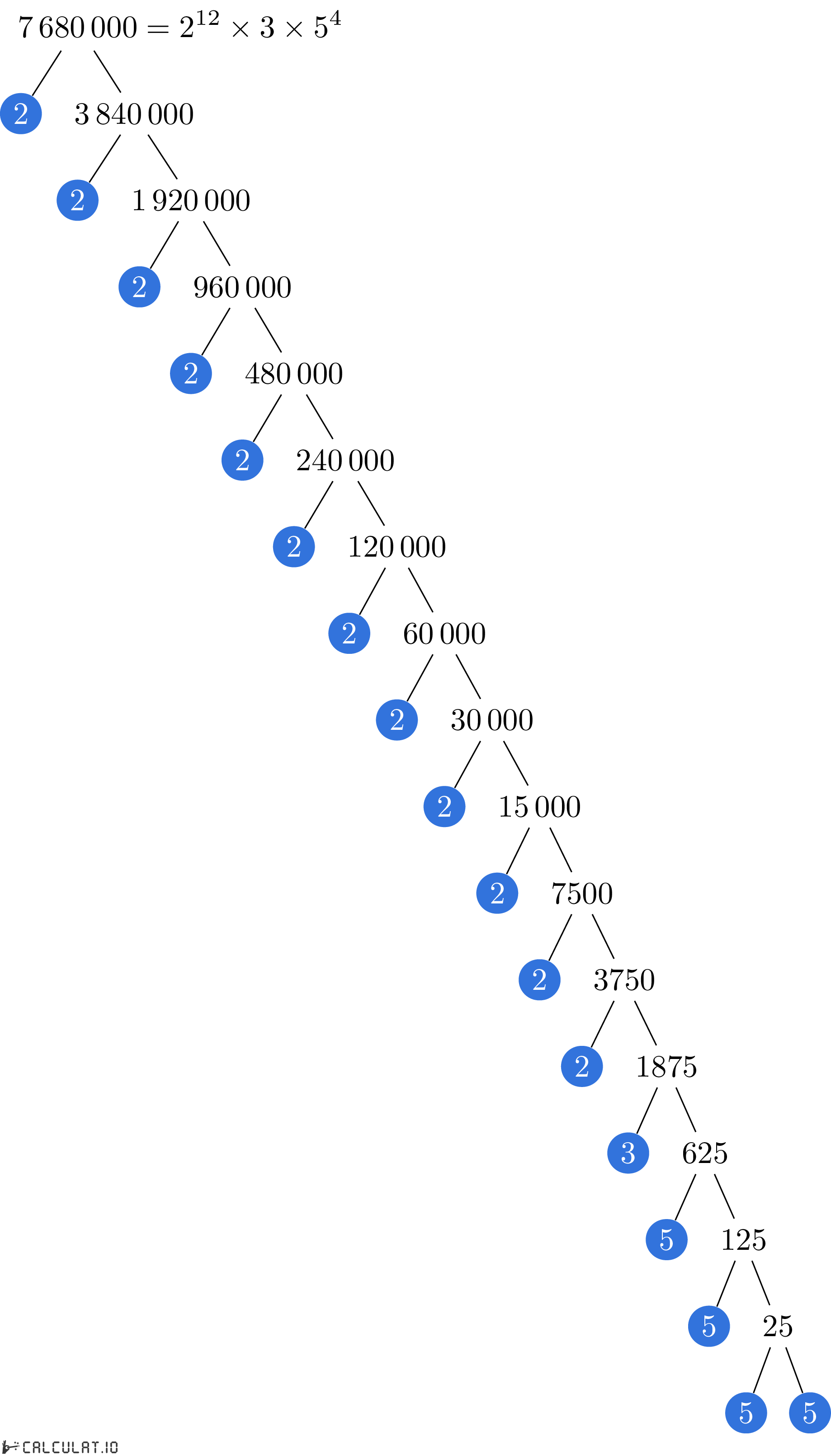 Factores primos de 7680000: 2, 2, 2, 2, 2, 2, 2, 2, 2, 2, 2, 2, 3, 5, 5, 5, 5