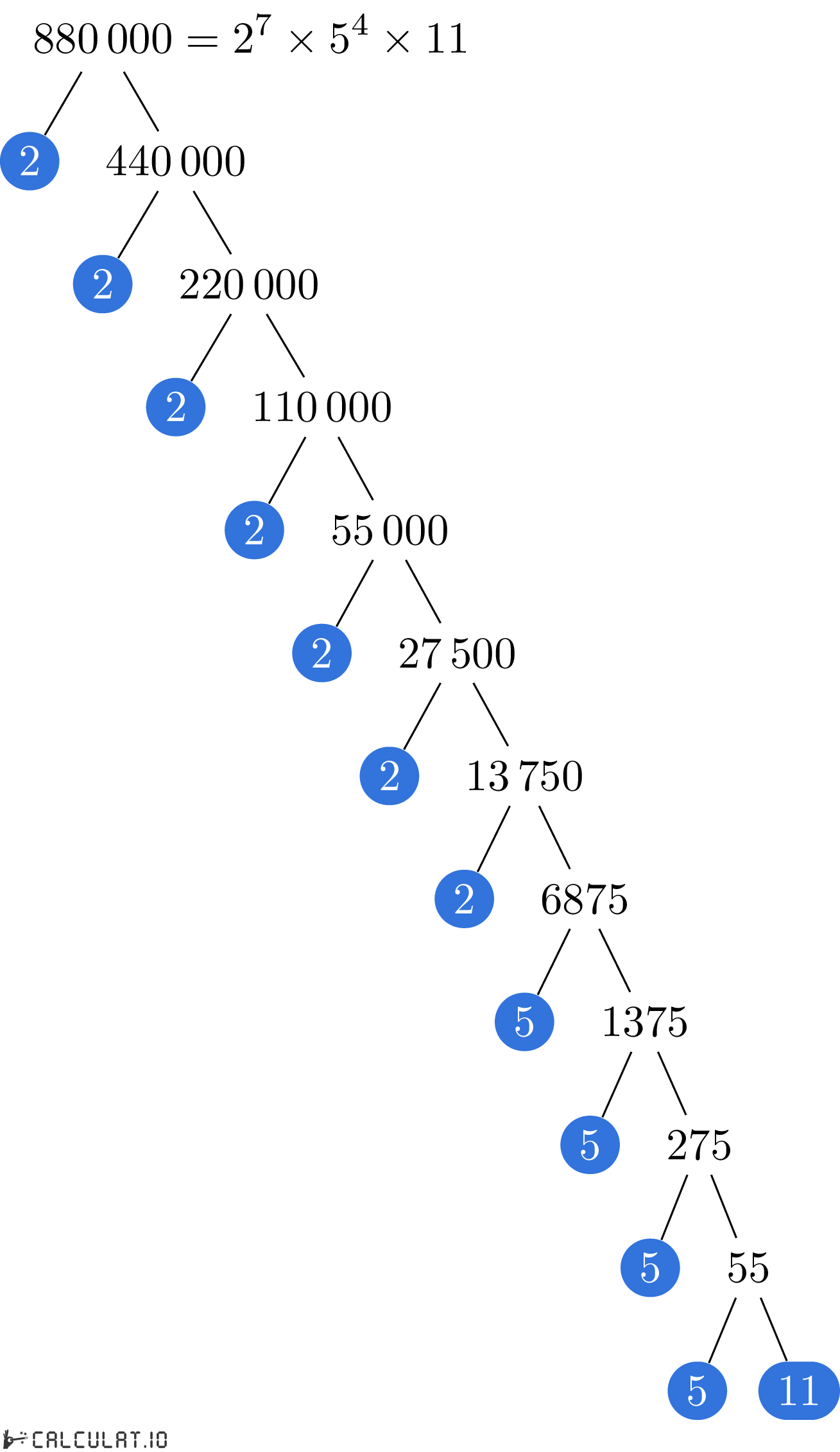 Factores primos de 880000: 2, 2, 2, 2, 2, 2, 2, 5, 5, 5, 5, 11