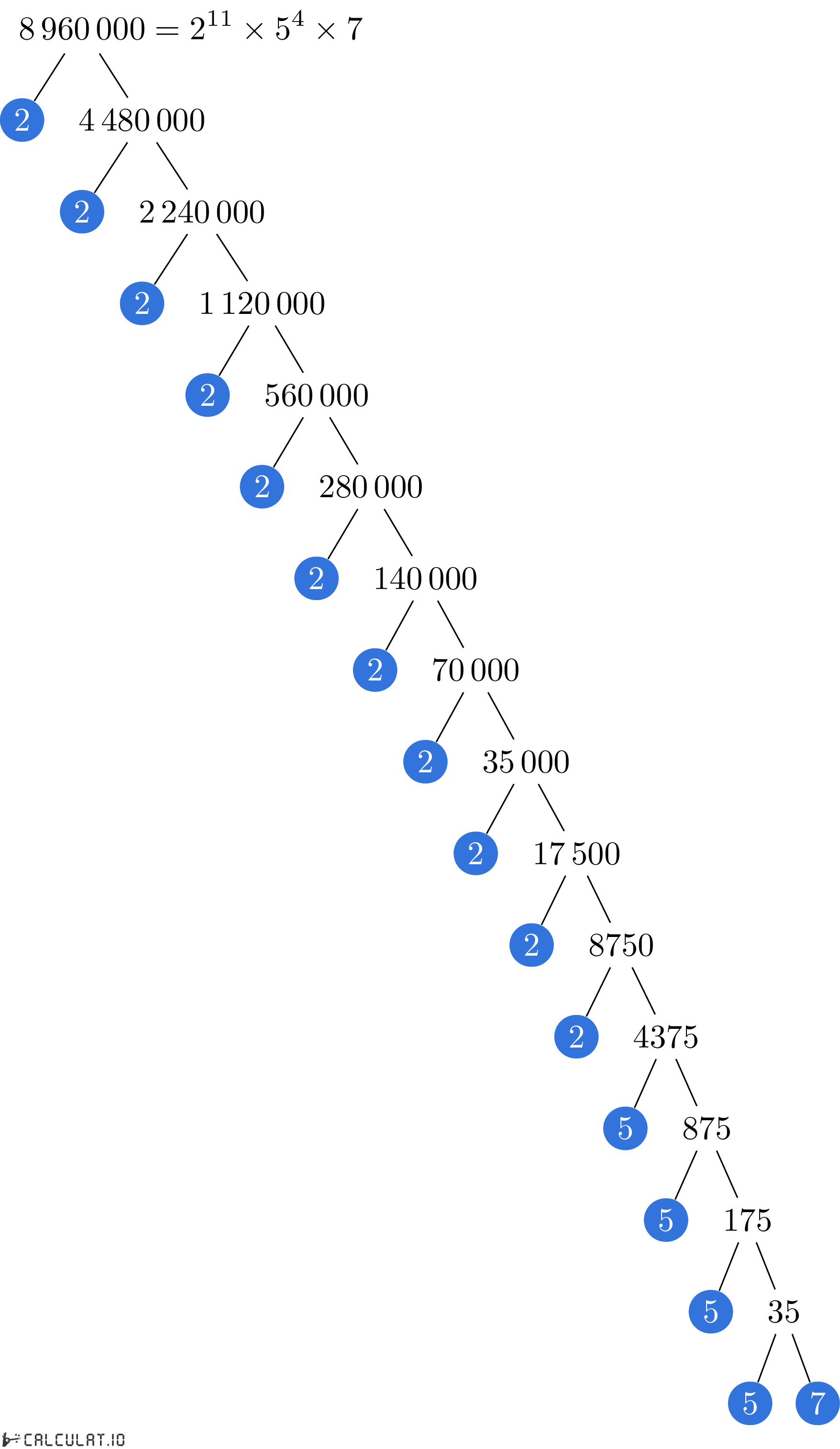 Factores primos de 8960000: 2, 2, 2, 2, 2, 2, 2, 2, 2, 2, 2, 5, 5, 5, 5, 7