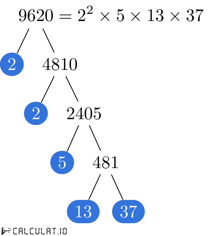 Factores primos de 9620: 2, 2, 5, 13, 37