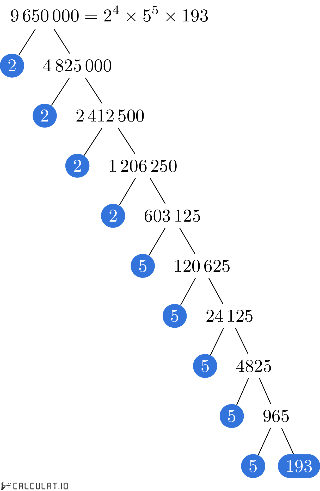 Factores primos de 9650000: 2, 2, 2, 2, 5, 5, 5, 5, 5, 193
