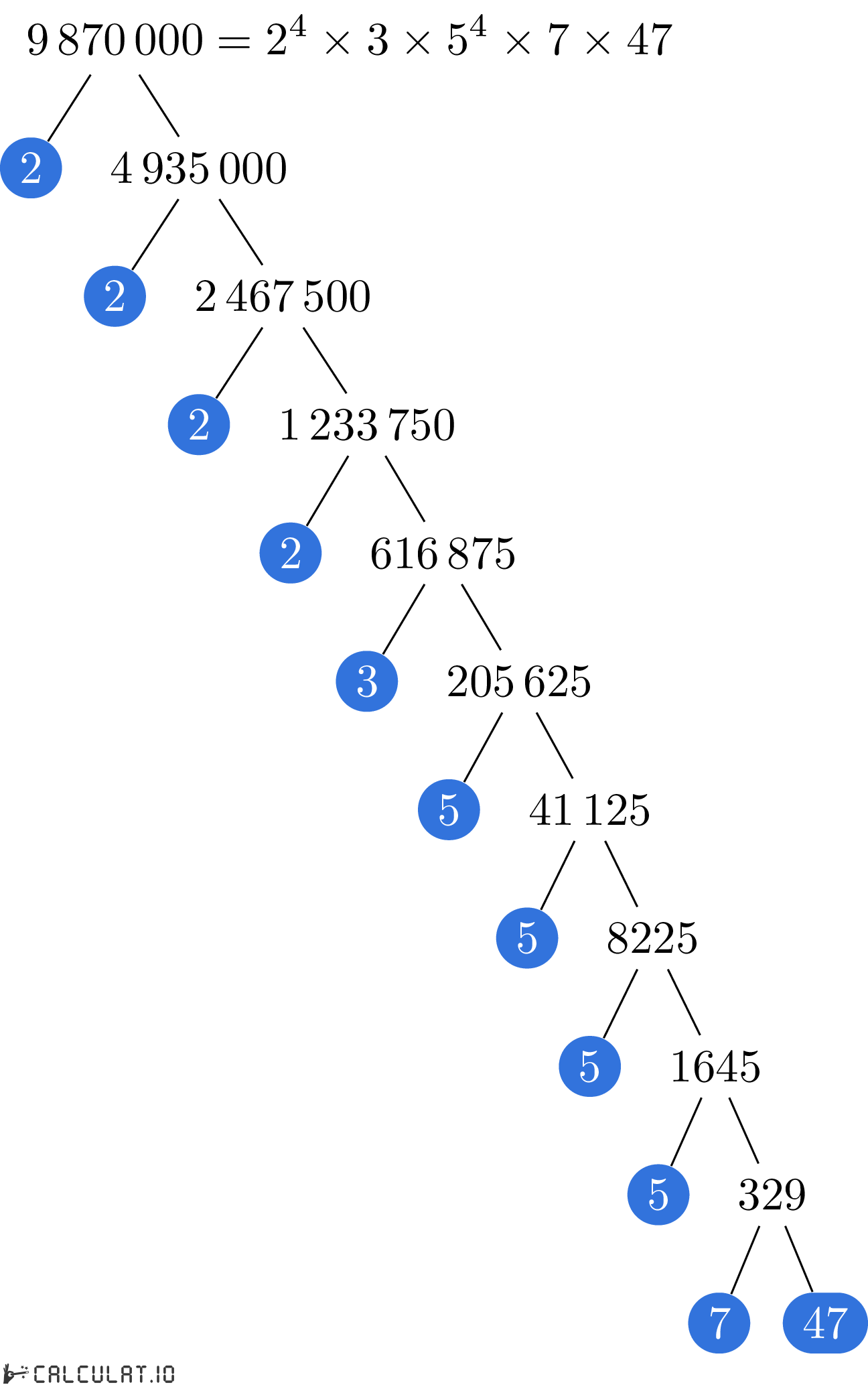 Factores primos de 9870000: 2, 2, 2, 2, 3, 5, 5, 5, 5, 7, 47