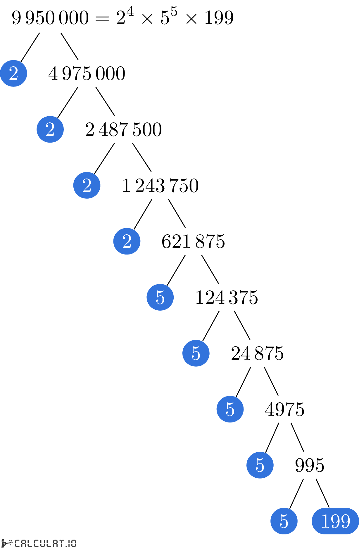 Factores primos de 9950000: 2, 2, 2, 2, 5, 5, 5, 5, 5, 199