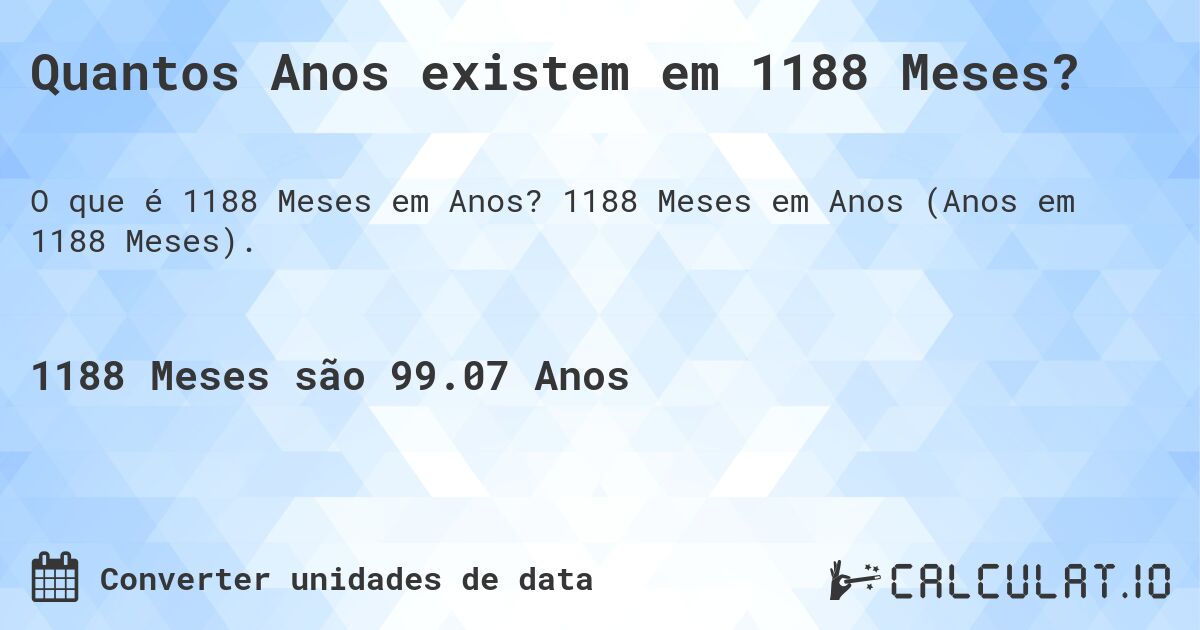 Um conversor online de unidades de tempo é uma ferramenta útil que ajuda você a converter rapidamente e com precisão durações de tempo de uma unidade para outra. Seja necessário converter segundos, minutos, horas, dias, semanas, meses ou anos, essa ferramenta simplifica o processo. Com este conversor, você pode facilmente e rapidamente converter períodos de tempo para uma unidade de medida diferente. Por exemplo, pode ajudá-lo a descobrir o que é 1188 Meses em Anos? (A resposta é: 99.07).
