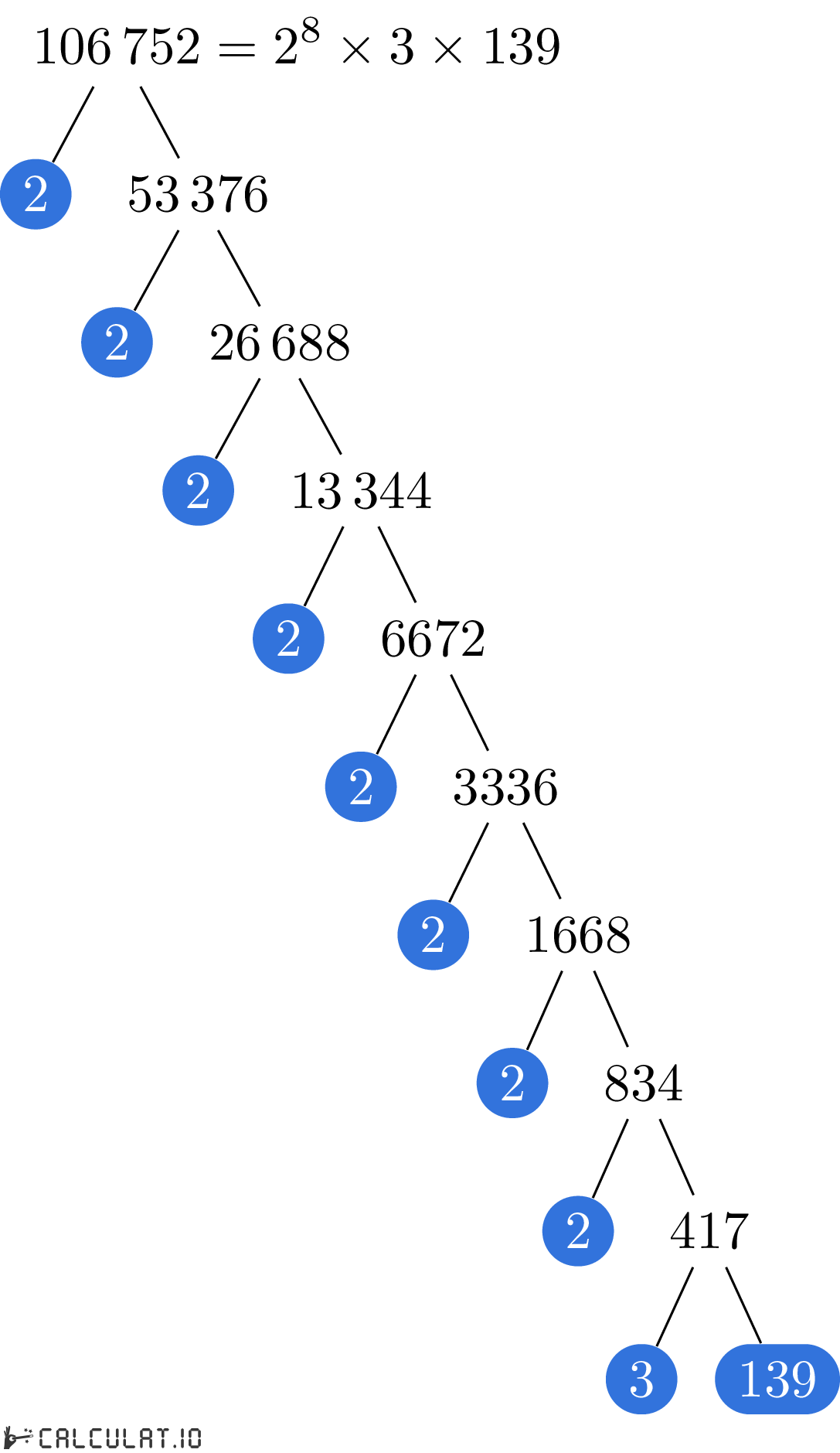 Fatores Primários de 106752: 2, 2, 2, 2, 2, 2, 2, 2, 3, 139