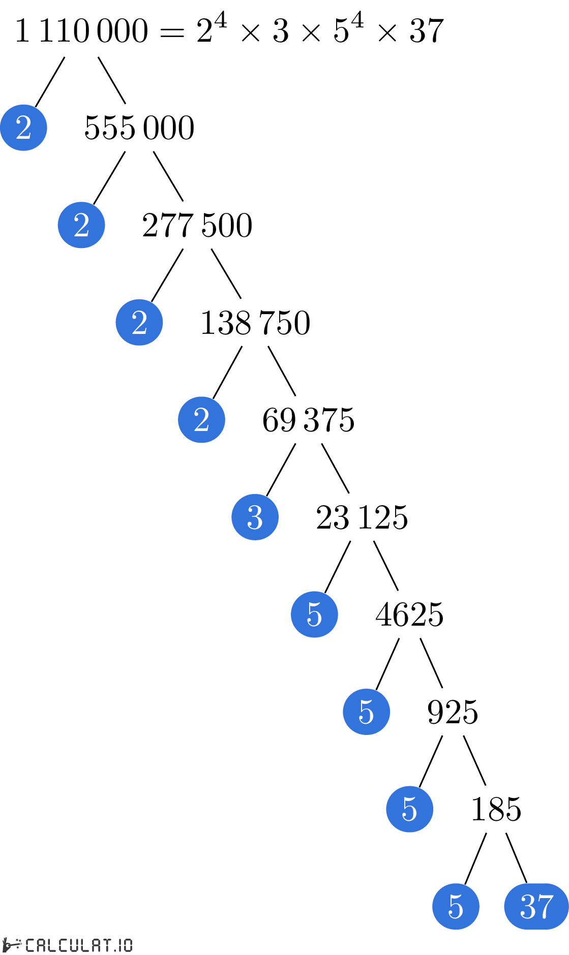 Fatores Primários de 1110000: 2, 2, 2, 2, 3, 5, 5, 5, 5, 37