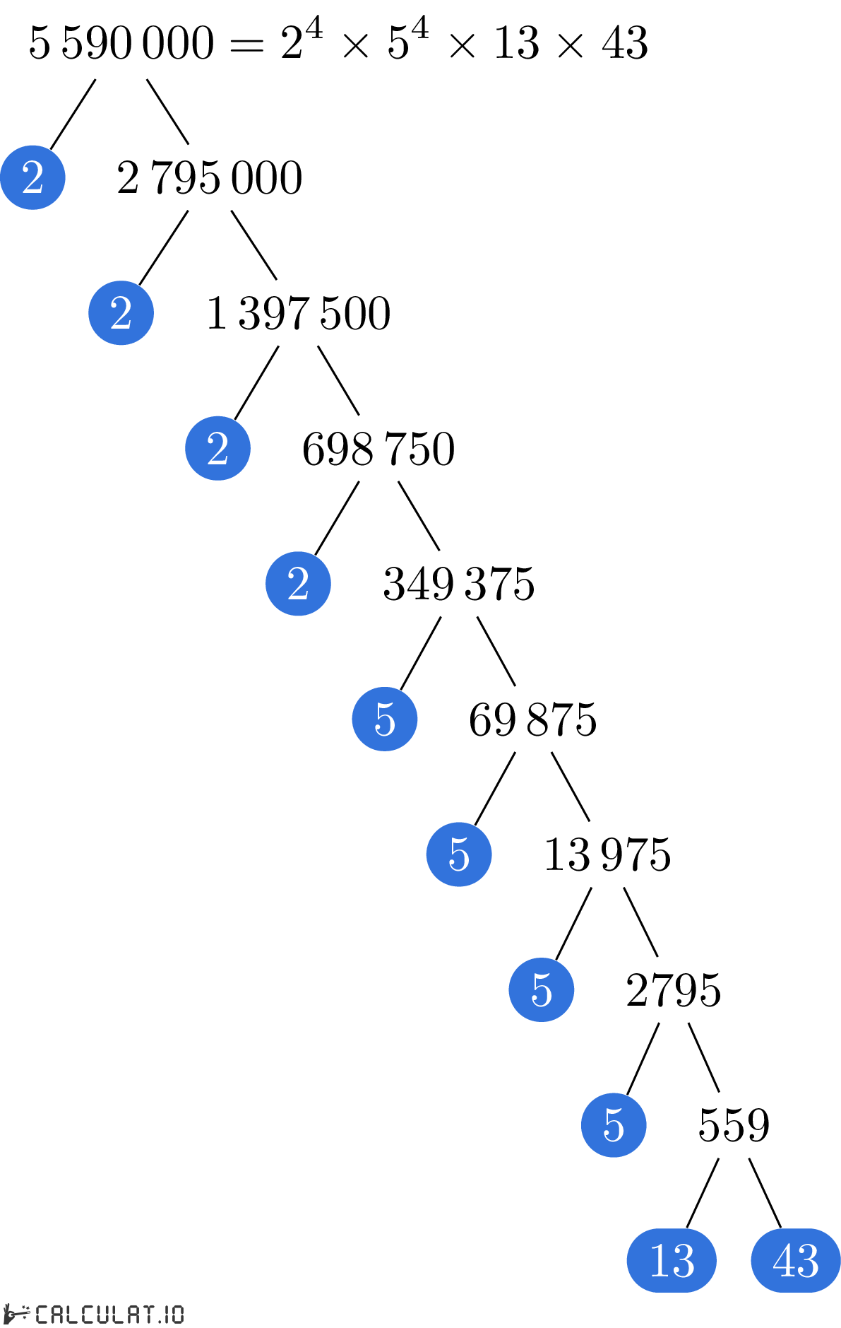 Fatores Primários de 5590000: 2, 2, 2, 2, 5, 5, 5, 5, 13, 43